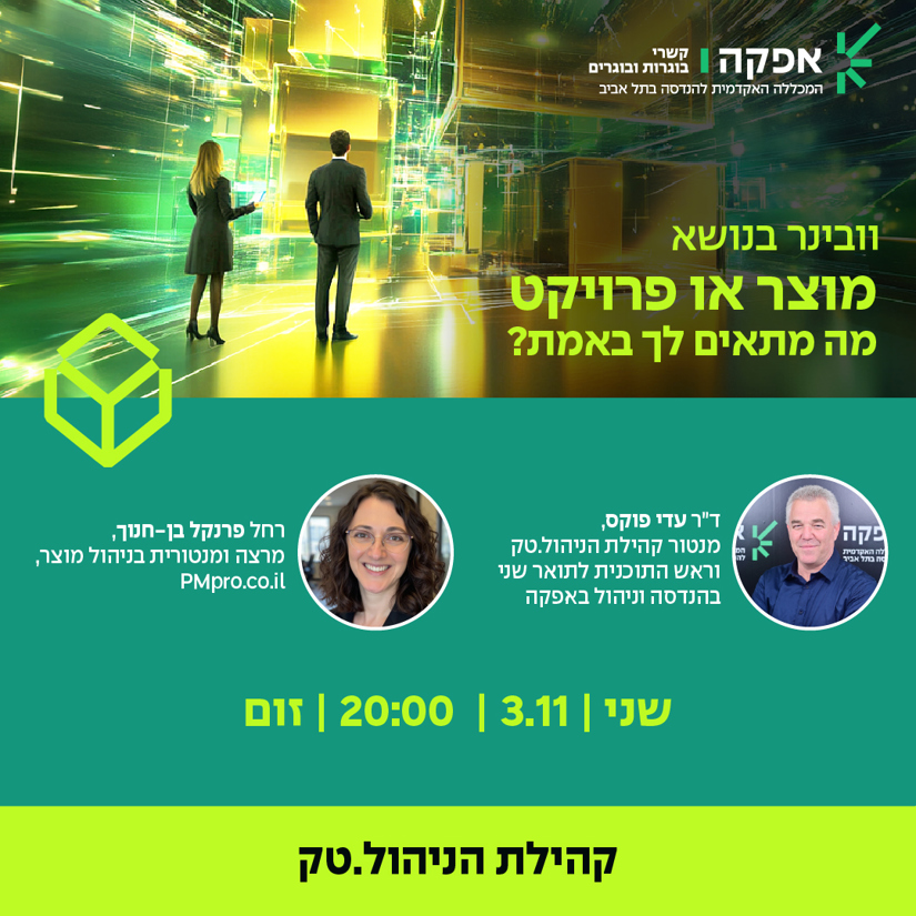 למתעניינים בפיתוח מקצועי באחד מתחומים אלו, תינתן הצצה בבסיום הוובינר לשני קורסים מקצועיים בניהול מוצר ובניהול פרויקטים שמתקיימים ביחידת לימודים לאורך החיים של אפקה. יוצגו מבנה, תכנים ויתרונות לבוגרים מהתעשייה.
