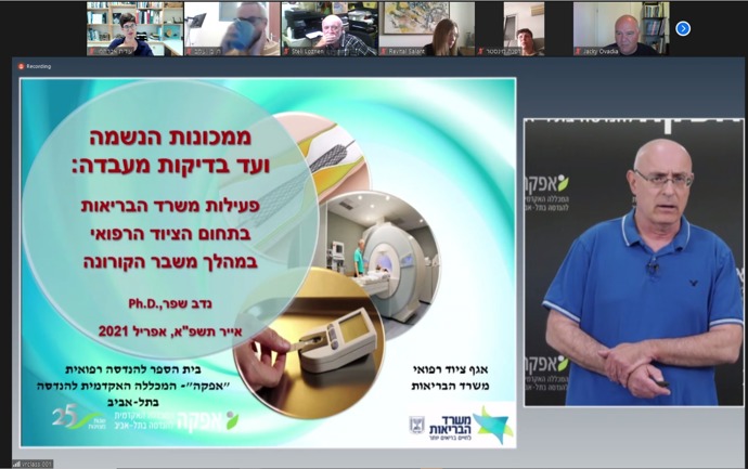 ד"ר ערן פלג, מנהל מחלקת הנדסה וייעוץ בכללית הנדסה רפואית, נתן תמונת מצב אודות הרפואה הביתית בקהילה.ד"ר נדב שפר, חבר סגל והאחראי על חטיבת הנדסה קלינית בביה"ס להנדסה רפואית באפקה, סקר את פעילותו של משרד הבריאות בתחום הציוד הרפואי בעת משבר הקורונה. הרצאתו הבהירה כי למרות השאיפה להעביר פעולות רפואיות רבות בתחום לבית המטופל יש להתחשב גם בשאלות של דיוק הטיפול וביכולות של מבצע הפעולה.