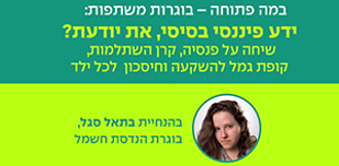 קהילת הבוגרות מזמינה: בתאל סגל, בוגרת הנדסת חשמל, תשתף מניסיונה בנושא ידע פיננסי בסיסי - פנסיה, קרן השתלמות ועוד. 6.8 בשעה 20:30 בזום.